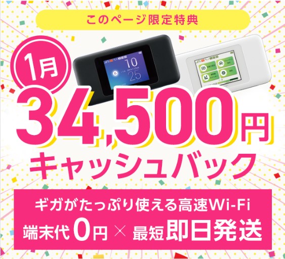 GMOとくとくBB(キャッシュバック)は、業界最大34,500円キャッシュバック実施中でコスパ最強です!3年間の総額料金はどこよりも安いので、一番おとくにWiMAXを使いたい方には絶対おすすめ!さらにギガ放題プランもあり、映画・ゲームなど思う存分遊べます!最新端末無料・即日発送と嬉しいポイントがたくさん!回線速度や対応エリアが不安な方も、発送から20日間キャンセル無料なので安心です!